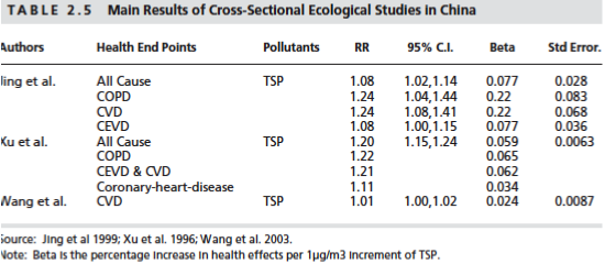There is no cohort study in China and only three cross-sectional studies that reflect the effects of long-term air pollution exposure on mortality. In China, Jing et al. (1999), Xu et al. (1996a, 1996b, 2000), and Wang et al. (2003) investigated
