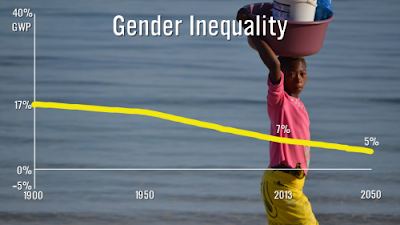 The assessment considers the worldwide costs from 1900 to 2050 of continued gender inequality. The main cost is considered to be the inefficient underutilization of women in production. This can be measured in terms of their correspondingly lower earnings and expressed as a percentage of actual GDP per annum. This loss is estimated to lie in the range of 4 percent to 37 percent of world GDP per annum over this time period, depending on the year and the assumptions made. The losses due to gender inequality are declining as a percentage of GDP over this time period, but the absolute sizes of the losses are still quite substantial, since world GDP is growing so substantially over this period. This can be seen in part by comparing the losses in terms of 1900 GDP: In 2050, which has the lowest potential losses (4 percent) as a percentage of GDP based on the lower loss projections, the loss attributable to gender inequality comprises 328 to 1019 percent of total world GDP as of 1900, which is a range of $6 to $20 trillion in 1900 dollars, well over what world output was worth in 1900.