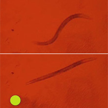 Worm workout: A light-activated “off” switch can control the movement of microscopic worms. Scientists engineered the worms to express the switch in motor neurons that control the organisms’ ability to swim. Without light, the worms swim normally. But when they are exposed to yellow light, as indicated by the yellow circle, their motor neurons can no longer function, paralyzing the worms.