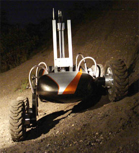 Image at left: This robot shares some features with the lunar truck [below after the jump], but is equipped with a drill designed to find water and oxygen-rich soil on the moon. Credit: Carnegie Mellon University