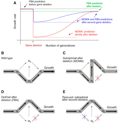 Schematic illustration of the consequences of gene deletion on the organism’s growth rate. (A) The growth rate following the deletion of an enzyme-encoding gene often drops, but after many generations may recover to a new optimal value not very different from the original one (red line). The optimal growth rate before and after the deletion is predicted by FBA (black and green dotted lines). The blue line indicates the predicted buffering effect of additional gene deletions: by deleting appropriately selected additional genes, the suboptimal growth rate shortly after gene deletions is higher than without the rescue deletions. (B–E) The effect of rescue deletions on the fluxes of a metabolic network, where M1 … M4 represent metabolites and the width of the arrows represents the strength of individual fluxes.