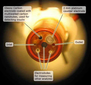 The new electrode is built from multiwalled carbon nanotubes, which are like several flat sheets of carbon atoms stacked and rolled into very small tubes. Provided by William Hofmeister at the University of Tennessee Space Institute, the nanotubes are electrically conductive and the concentration of insulin in the chamber can be directly related to the current at the electrode and the nanotubes operate reliably at pH levels characteristic of living cells.