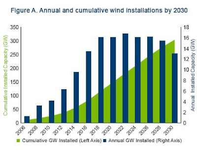 By 2020, the overall German onshore capacity could be at 45,000 MW, assuming an optimal use of sites and no general height restrictions for turbines [ie everything goes the wind industry way], with an additional 10,000MW offshore. This would account for about 25% of German electricity consumption, or about 150 TWh/year.