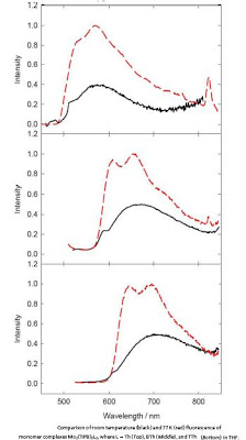 The molecules didn’t just fluoresce as some solar cell materials do. They phosphoresced as well. Both luminous effects are caused by a material absorbing and emitting energy, but phosphorescence lasts much longer.