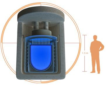 The Hyperion Power Generation uranium hydride liquid metal fission reactor will weigh fifteen to 20 tons, depending on whether you’re measuring just the reactor itself or the cask—the container that we ship it in—as well. It was specifically designed to fit on the back of a flatbed truck because most of our customers are not going to have rail. It’s about a meter-and-a-half across and about 2 meters tall. It will generate 27-30 Megawatts of electrical power from 70 MW of thermal power. This means 0.5 to 0.75 tons per MWe for the nuclear reactor. The steam turbine to convert the power is counted separately. The core size is about one seventh the size of compact sub reactor cores.
