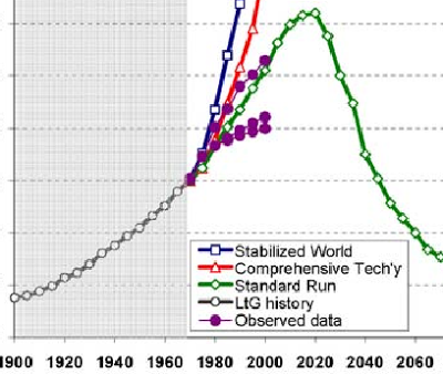 The “actual data” line has nothing to do with anything that was considered pollution in 1972; it’s CO2. CO2 is a very cheesy proxy for pollution, since the Earth has a hormesis response to its levels: too little of it would be as disastrous as too much (ice ages). Meanwhile, the levels of actual pollutants have gone down in the more advanced industral societies even as they have gone up in the more recently-developing ones such as China. History indicates that pollution levels rise with industrialization to a certain level and then decline, a phenomenon that LtG completely ignores. (and if we’re substituting, why can’t we have “computing cycles per capita” in Services?) So I would claim that this graph is comparing apples and oranges and says nothing substantive.