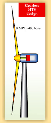AMSC (American Superconductor and Texas-based TECO-Westinghouse Motor Co have been working an estimated $6.8 million project to design components for a 10-MW HTS generator. Another HTS device manufacturer, Germany’s Zenergy Power Group, is working with Converteam Ltd in the UK to commercialize an 8-MW HTS wind-turbine generator. Because of the practical limitations to erecting large turbines, a generator’s size and weight do matter, says Larry Masur, a Zenergy vice president. Several groups expect to have generator prototypes ready for testing within two years but commercialization will take 10-15 years to get competitive costs. Kite generated wind and other alternatives to turbines seem like the better approach.
