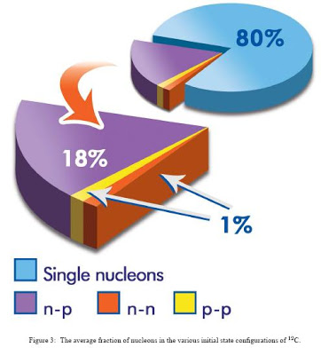Nuclei are composed of bound protons and neutrons, referred to collectively as nucleons (the standard notation is p, n, and N, respectively). A standard model of the nucleus since the 1950s has been the nuclear shell model, where neutrons and protons move independently in well-defined quantum orbits in the average nuclear field created by their mutual attractive interactions. In the 1980s and 1990s, proton removal experiments using electron beams with energies of several hundred MeV showed that only 60-70% of the protons participate in this type of independent-particle motion in nuclear valence states. At the time, it was assumed that this low occupancy was caused by correlated pairs of nucleons within the nucleus. Indeed, the existence of nucleon pairs that are correlated at distances of several femtometers, known as long-range correlations, has been established (3), but these accounted for less than half of the predicted correlated nucleon pairs. Recent high momentum transfer measurements have shown that nucleons in nuclear ground states can form pairs with large relative momentum and small center-of-mass (CM) momentum due to the shortrange, scalar and tensor, components of the nucleon-nucleon interaction. These pairs are referred to as short-range correlated (SRC) pairs. The study of these SRC pairs allows access to cold dense nuclear matter, such as that found in a neutron star.