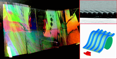 Nano press: This 10-by-30-centimeter plastic sheet (top) has been patterned with a series of nanoscale polymer lines using roll-to-roll nanoimprint lithography (bottom). The film is iridescent because of the way its nanoscale features scatter light. Credit: ACS Nano