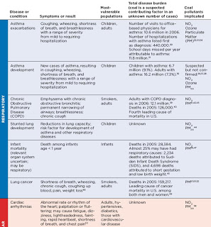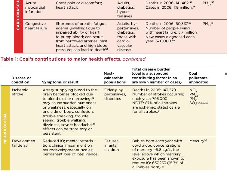 Among other adverse effects, the report links coal pollution to: Asthma, stunted lung development, infant mortality, lung cancer, abnormal heart rates or heart attacks, congestive heart failure, stroke and developmental delays.