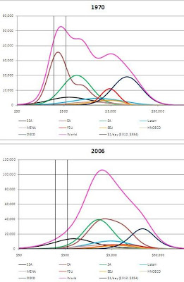 Goldmans Sachs had a forecast of GDP for the top 22 countries until 2050 and this was used to approximate world GDP growth. Using wikipedia estimates of future population the mean average GDP per capita was calculated. This was used to approximate the shift in modal income into the future.
