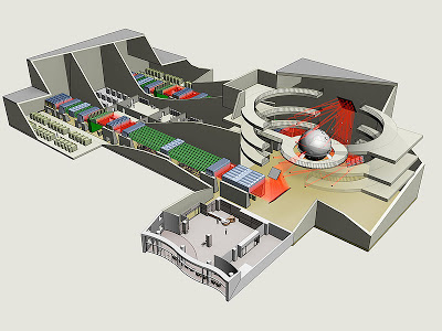 HiPER’s layout from a preliminary design study. The ignition lasers are on the left, the drivers on the right (just visible in the cutaway). The main amplifiers (in darker blue) are at the upper left end of the building, driven by the capacitor banks in the smaller buildings on either side. Spatial filters are shown in green. The large silver boxes contain diffraction gratings that compress the passage of the light into a very short pulse of about 10 ps. The ignition system is focused onto a single spot entering on the left side of the chamber, whereas the compression beams are reflected to shine into the chamber from all directions.
