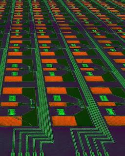 Optical microscope photographic image of an array of nanophotonic avalanche photodetectors on a silicon chip