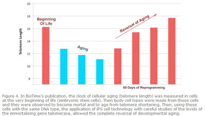 In BioTime’s report, we show that the premature aging observed in the existing iPS cell lines studied was due to the fact that the telomere clock of cellular aging in at least many of the lines being used in the scientific community is set at a relatively old (short) level. However, using a system where cells with the same DNA type at young embryonic states, as well as aged states were used, BioTime scientists reported that by looking for cells with sufficient levels of the immortalizing protein telomerase, they were able to reset the clock of aging back to the embryonic state. So, both the process of development wherein the germ-line cells specialize into the cells of the body, and also the telomere clock of aging was reported in the study. This reversal of developmental aging may be the seed for future technologies that will one day allow young cells of any kind to be produced for aging patients for use in repairing the heart, the blood system, the brain, and the retina, as well as many others applications.