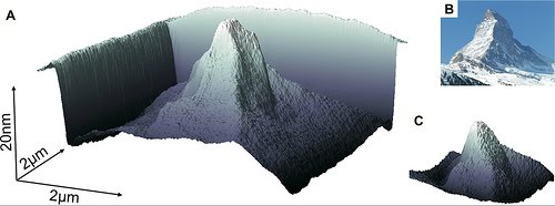 Using a novel nanotip-based patterning technique, IBM scientists have created a 25 nanometer-high replica of the Matterhorn peak, a famous Swiss mountain that soars 4,478 m (14,692 ft) high on a piece of molecular glass, representing a scale of 1:5 billion (1 nanometer corresponds to 57 altitude meters). To create the 3D replica 120 individual layers of materials were removed. IBM Research web page for Nanometer-scale direct-write 3D patterning using probes