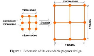 Microwires and nodes are connected on a small grid but that surface and the wires are designed to be stretch up to 256 times larger area (16 times linearly). So what starts as a 8X8 centimeter square could become 1 meters by 1 meters of connected microwires. The technique is simple and will be applicable for microwires and nanowires.