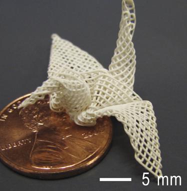 The tiny origami crane sitting on a penny in the picture from University of Illinois professor Jennifer Lewis’ lab heralds a new method for creating complex three-dimensional structures for biocompatible devices, microscaffolding and other microsystems. The penny-sized titanium bird began as a printed sheet of titanium hydride ink.