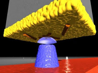 With MRFM, the sample to be examined is attached to the end of a tiny silicon cantilever (about 100 millionths of a meter long and 100 billionths of a meter wide). As a magnetic iron cobalt tip moves close to the sample, the atoms’ nuclear spins become attracted to it and generate a small force on the cantilever. The spins are then repeatedly flipped, causing the cantilever to gently sway back and forth in a synchronous motion. That displacement is measured with a laser beam to create a series of 2-D images of the sample, which are combined to generate a 3-D image.