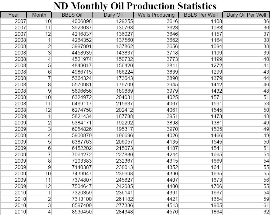 North Dakota latest monthly oil production is another new record at 284,348 barrels per day in April. This is almost double the production two years ago in March, 2008.