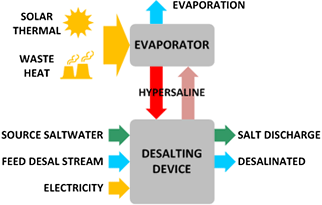 Saltworks’ patent pending technology employs an innovative Thermo-Ionic™ energy conversion system that uses up to 80 per cent less electrical/mechanical energy relative to leading desalination technologies. The energy reduction is achieved by harnessing low temperature heat and atmospheric dryness to overcome the desalination energy barrier. Saltwater is evaporated to produce a concentrated solution. This solution, which has concentration gradient energy, is fed into Saltworks’ proprietary desalting device to desalinate either seawater or brackish water. Some electrical energy is used to circulate fluids at a low pressure, yet the bulk of the energy input is obtained through the evaporation of saltwater.