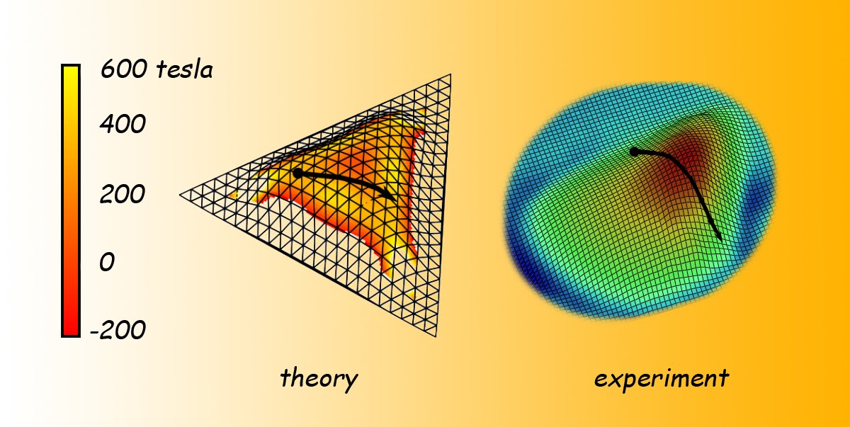 Sure enough, close examination of the triangular bubbles revealed that their chicken-wire lattice had been stretched precisely along the three axes needed to induce the strain orientation that Guinea and his coworkers had predicted would give rise to pseudo-magnetic fields. The greater the curvature of the bubbles, the greater the strain, and the greater the strength of the pseudo-magnetic field. The increased density of electron states revealed by scanning tunneling spectroscopy corresponded to Landau levels, in some cases indicating giant pseudo-magnetic fields of 300 tesla or more.