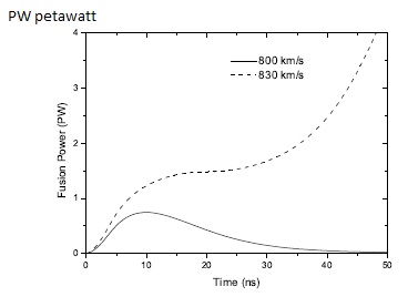 A millimeter diamond bullet with the kinetic energy of 1 to 2 MJ, or at the speed of about 1000 km/s, is sufficient to initiate a propagating thermal nuclear burn. The paper shows more energy generated in the shot. The simulation is only the initial impact and initial ignition. The energy probably goes to 100-200 nanoseconds. They just stopped the simulation so far at 50 nanoseconds as seen in the graph above. So my guess is 3-7 times more energy. Plus I think more more energy with a faster shot.