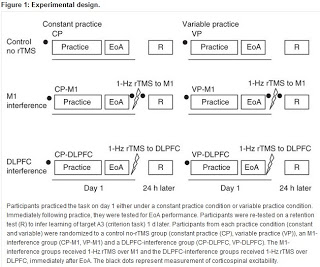 These results are the first, to the best of our knowledge, to demonstrate that motor-memory consolidation engages distinct neural substrates that differ depending on practice structure. Practice structures that are more cognitively challenging (that is, variable) may rely on higher-order motor areas such as the dorsolateral prefrontal cortex for motor-memory consolidation, whereas less cognitively challenging constant practice structures may depend more heavily on primary motor cortex to mediate motor-memory consolidation. These results deepen our understanding of motor-memory organization and provide new insights into the mechanisms supporting consolidation of motor skills