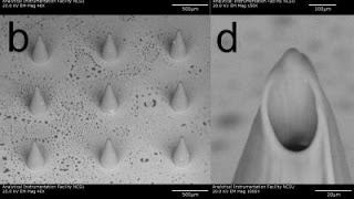 Hollow microneedles open the door to new techniques for diagnosing and treating a variety of medical conditions. A research team at North Carolina State University has created small microneedles to be used in the treatment of medical conditions by inserting nanoscale dyes called quantum dots into the skin. This new procedure could advance a doctor’s ability to diagnose and treat a variety of conditions, including skin cancer. Microneedles are very small needles, where in one dimension, such as length or width, the size is less than one millimeter (0.04-inches). They were able to fabricate hollow, plastic microneedles using a laser-based rapid-prototyping approach and found that they could deliver a solution containing quantum dots using these microneedles