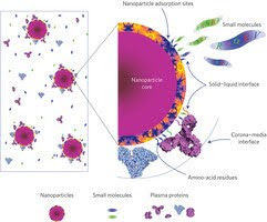 Left: in a physiological environment, nanoparticles are exposed to different proteins and small molecules. Right: the competitive adsorption of small molecules (upper) and the amino-acid residues of proteins (lower) on a nanoparticle.