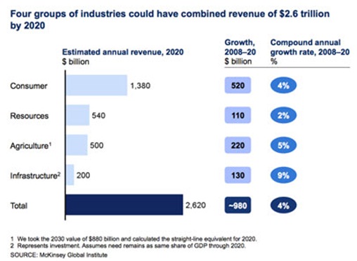 The outlook for further growth in Africa’s resource sectors remains promising. We estimate the total value of annual production could grow steadily at between 2 percent and 4% a year, to $540 billion by 2020.