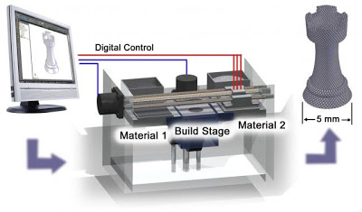 Voxels are the building blocks for making things. A rapid assembler will select and organize these Voxels and build them layer by layer into an object. Because you can select different Voxels you can give your object lots of different material properties, even properties that have been impossible. Voxels will then be true digital materials.