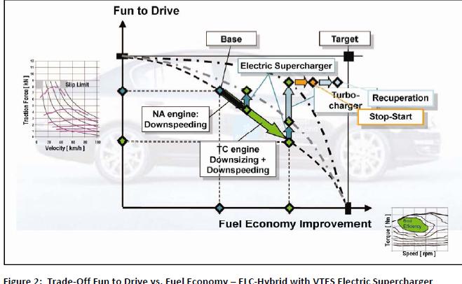 Controlled Power Technologies (CPT), in conjunction with AVL Graz, has been working for the past 18 months on addressing the currently uneconomic mild hybrid ‘gap’ with a value driven ’micro/mild‘ HEV solution, utilising CPT’s production ready VTES electric supercharger (19 page pdf). CPT and AVL’s most recent work assesses the potential of a VTES equipped downsized ELC‐Hybrid vehicle in combination with the CPT SpeedStart® Integrated Starter Generator and a cost effective and robust low voltage battery technology.