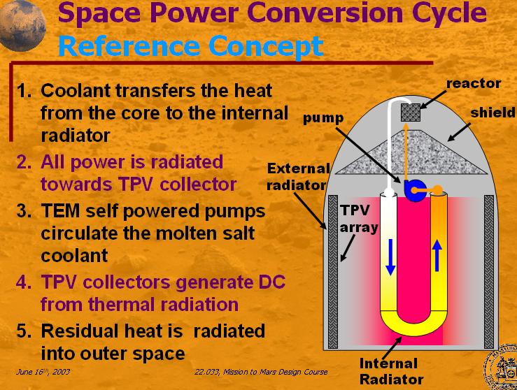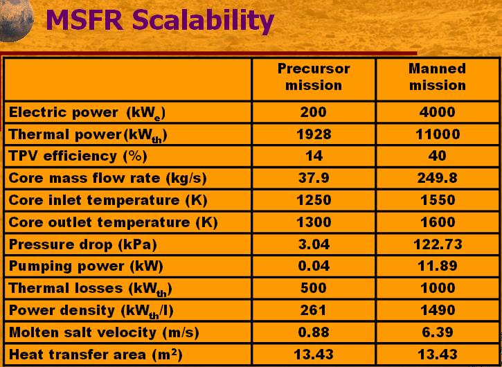 There are small 25 MWe fast reactors being developed by Hyperion Power Generation that would be could be in the 2kg/KWe range and should be ready around 2013-2018. The reactor would weigh 15 tons (another five tons for a cask.) It could also use a proposed thermophotovoltaic system to convert the heat to electricity (in an MIT study which this article will cover). Hyperion Power Generation is not building molten salt reactors, but uranium nitride reactors that are lead-bismuth cooled. There are older studies of uranium nitride reactors for space applications.