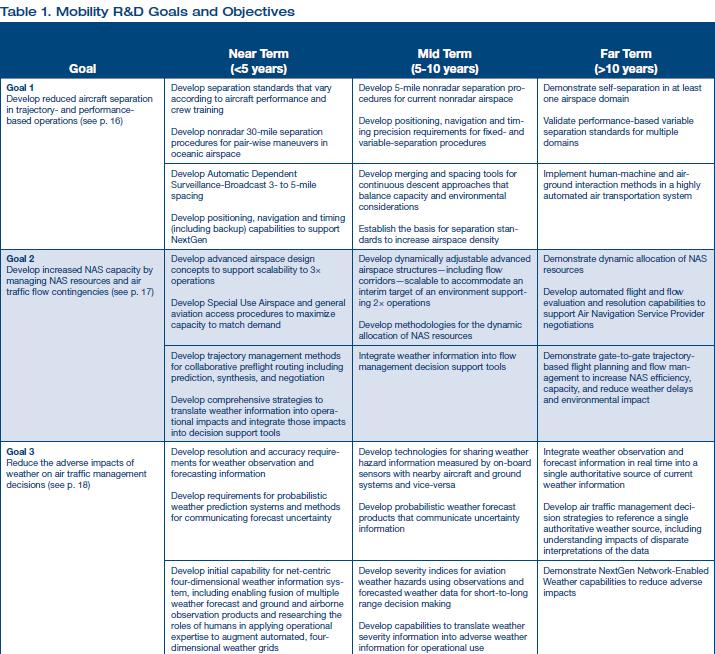 Goal 1—Develop reduced aircraft separation in trajectory- and performance-based operations Goal 2—Develop increased NAS capacity by managing NAS resources and air traffic flow contingencies Goal 3—Reduce the adverse impacts of weather on air traffic management decisions Goal 4—Maximize arrivals and departures at airports and in metroplex areas Goal 5—Develop expanded manned and unmanned aircraft system capabilities to take advantage of increased air transportation system performance