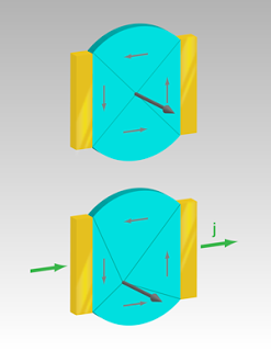 Permalloy disk sample and contacts for current injection. (Top) Four 90° domain walls intersect at the vortex core with its out-of-plane magnetization. (Bottom) As current flows through the disk, the vortex core is displaced due to the magnetic field of the current and due to spin-transfer torque. This displacement has been measured to quantify the nonadiabatic part of spin torque.