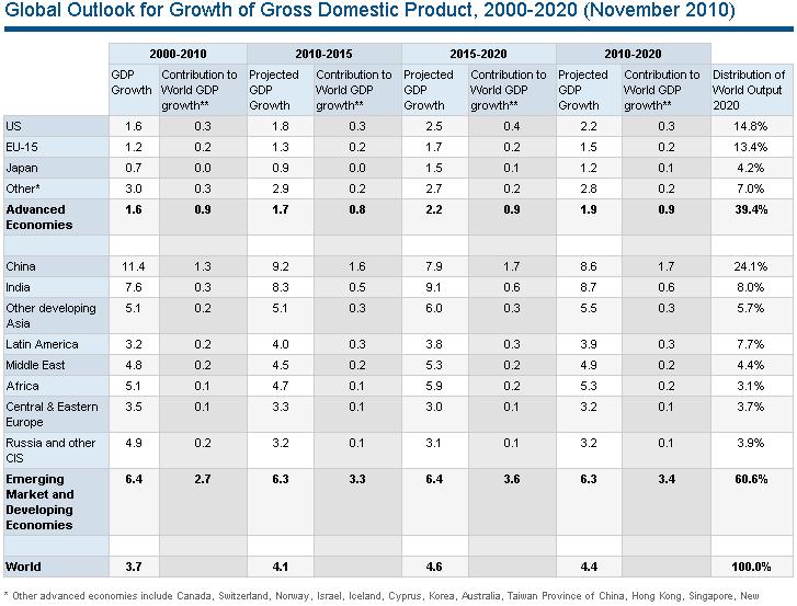 But his baseline scenario is that together with India, China will account for half of global growth from 2010 to 2020. Over the next decade, growth in emerging economies is expected to be more than three times faster than growth in advanced economies.
