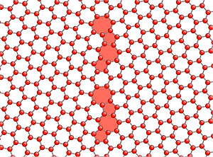 A computational study by Rassin Grantab and Vivek Shenoy at Brown University and Rodney Ruoff at the University of Texas at Austin reveals that graphene sheets with highly misaligned boundaries are actually stronger than slightly misaligned ones. As the image shows, misaligned grain boundaries consist of repeating pairs of 5- and 7-member rings separated by hexagonal rings. In simulations of the stress-strain curves as a function of the misalignment, the researchers found that, surprisingly, tensile strength increases with increasing misalignment angle