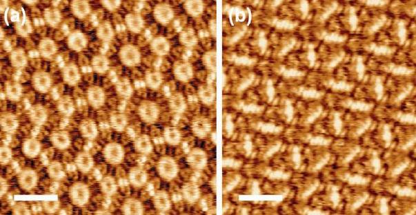 STM images of different regions of a single layer TPTC network, all scale bars are 23A. (23 Angstroms, 2.3 nanometers)