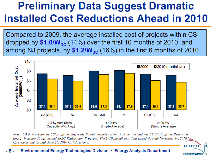 The report presents partial year data for systems installed in 2010 from the largest PV incentive programs in the country. In the California Solar Initiative Program, average installed costs dropped by $1.00/W between 2009 and the first ten months of 2010, and in New Jersey, costs dropped by $1.20/W between 2009 and the first six months of 2010.