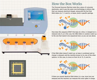 At the heart of the personal genome machine is a silicon chip with 21 million transistors on it–the equivalent of a desktop computer circa 1995. On top of the chip is a tiny channel the width of two human hairs into which DNA is fed. Each DNA molecule in the body contains two long strands of chemical letters, or bases–A,T, C and G–that come together like a twisted ladder (a.k.a. the double helix). The machine takes a single DNA strand and uses an enzyme to attach bases to it. Every time the enzyme connects two bases–an A to a T or a C to a G–an electrically charged ion is released and detected by sensors on the machine. By exposing the DNA sample to only one letter at the time, the machine can reconstruct the entire sequence.