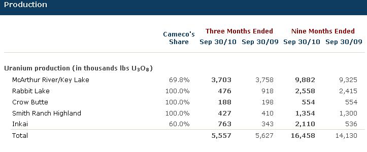 (Cameco) Canada’s 2010 uranium production is up about 17% over 2009.
