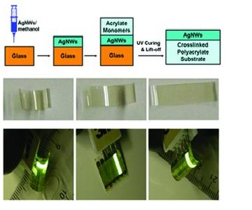 The resulting AgNW/polymer electrodes have high transparency, low sheet resistance comparable to ITO, and low surface roughness. They are substantially more compliant than ITO and would be suitable for the fabrication of high-performance and stretchable OLEDs and solar cells.