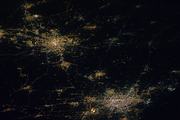 Beijing and Tianjin at night and map of the region