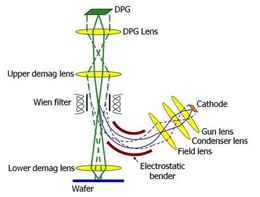 The spatially uniform, low energy spread electron beam is created on a thermionic cathode, accelerated to high energy (50 kilovolt), and rotated 90o via a magnetic prism toward a metal plate known as the dynamic pattern generator (DPG). The DPG features a 256 x 4000 array of micron-scale metal pixels, each pixel capable of individual biasing, that modulate the electron beams by biasing particular pixels of the array at either a low negative voltage (-2.1 volts) or at ground potential. When pixels are biased at -2.1 volts, the local electron beam is reflected; when pixels are biased at ground potential, the local electron beam is absorbed at very near zero energy. The patterned, reflected electron beam is then reaccelerated to 50 keV, rotated 90o by the magnetic prism, demagnified by a factor-of-50 in a magnetic optical system, and used to pattern the resist on the surface of the wafer.