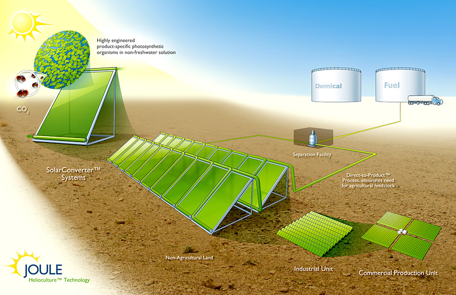 Joule says its “solar converter” technology makes the manufacture of liquid fossil fuels 50 times as efficient as conventional biofuel production – and eliminates as much as 90 per cent of carbon dioxide emissions