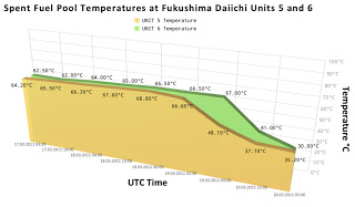 A second generator came online on 18 March, and the next day, the higher-capability Residual Heat Removal system recovered full function. Temperatures in the spent fuel pools of Units 5 and 6 have gradually returned to significantly lower temperatures (See graph above).