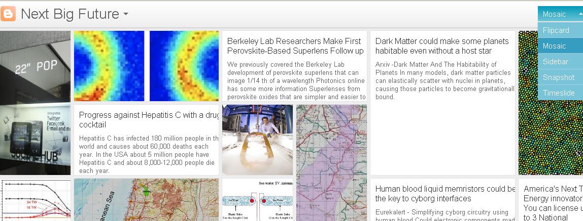 New viewing options are available for Nextbigfuture. These views require modern browsers such as Internet Explorer 8+, Firefox 3.5+, Chrome or Safari. Many elements of these views will not work should you have an older browser.