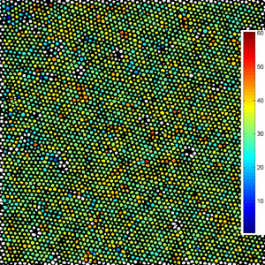 This is an orientation map of a spin-cast array of FePt nanoparticles. Most nanoparticles are enclosed by a hexagon of six neighboring nanoparticles. Each nanoparticle was color coded according to the angle (in degrees) of the hexagon’s orientation.
