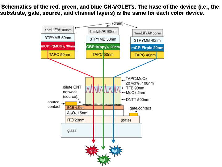 To skirt these issues, Rinzler and his colleagues used a network of carbon nanotubes to drive current. The nanotube layer is porous, letting light through, so the transistor and light-emitting layers can be stacked vertically instead of sitting side-by-side, saving real estate. Without having to squeeze in transistors right next door to the OLEDs, more area is devoted to emitting light. In fact, 98 percent of the device emits light.