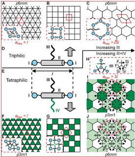 (A to C) Single-color triangular, square, and hexagonal honeycombs in triphilic T-shaped compounds (D) with increasing relative side-chain volume.
